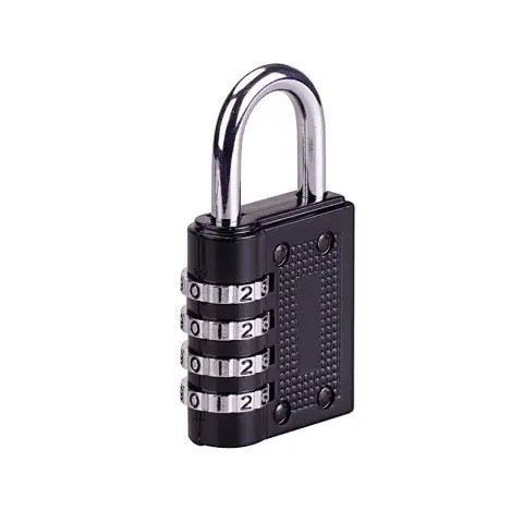 Black lacquered aluminum body with a long chromed steel shackle. Customizable 4-digit combination.
